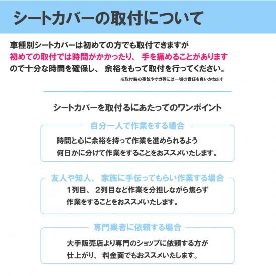 弊社では、「シートカバー取付専門店」としての立場から、取付は専門店への依頼をおススメしております。